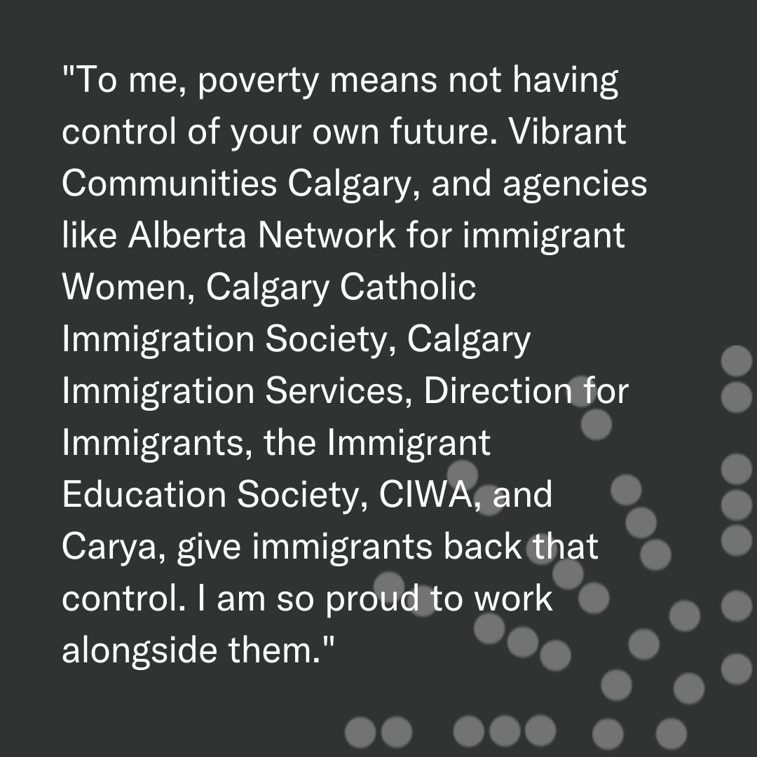 To me, poverty means not having control of your own future. Vibrant Communities Calgary, and agencies like Alberta Network for Immigrant Women, Calgary Catholic Immigration Society, Calgary Immigration Services, Direction for Immigrants, the Immigrant Education Society, CIWA, and Carya, give immigrants back that control. I am so proud to work alongside them.”