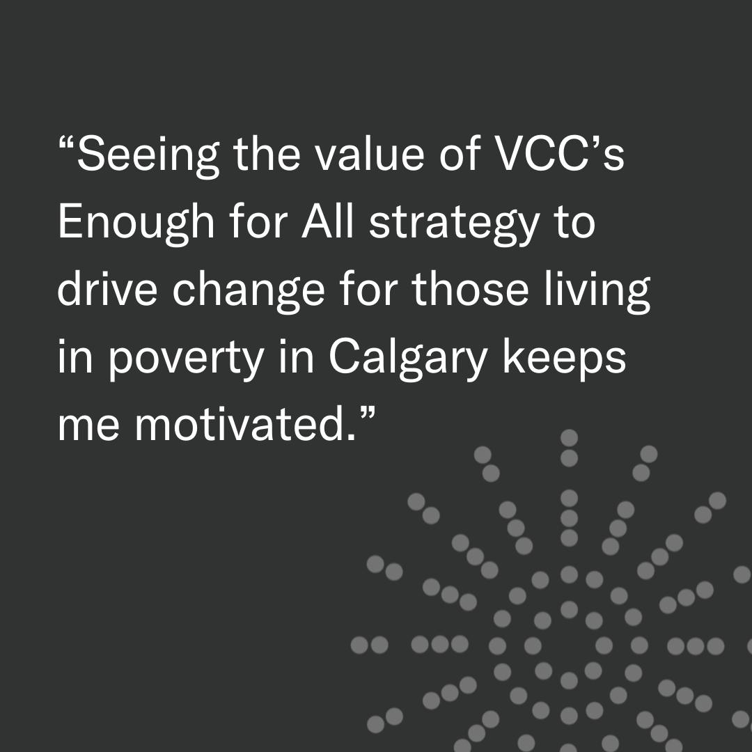 That group worked hard to drive policy changes to Alberta’s Maintenance Enforcement, so that single parents didn’t have to deal with the struggles we did. That time shaped my drive to make real, systems change and shaped my career path as an advisor and educator in responsible investing. Seeing the value of VCC’s Enough for All strategy to drive change for those living in poverty in Calgary keeps me motivated.”