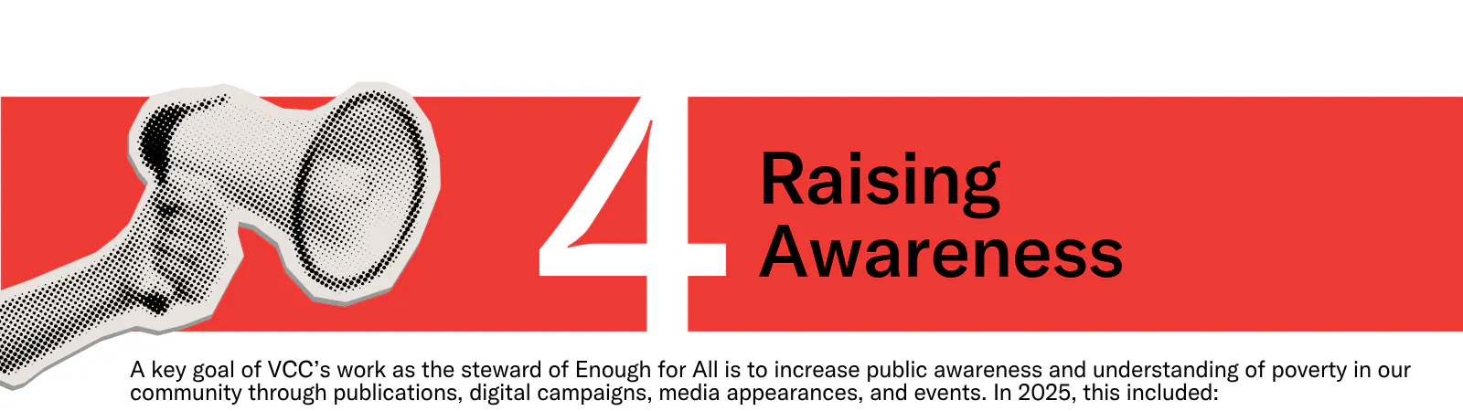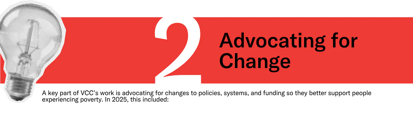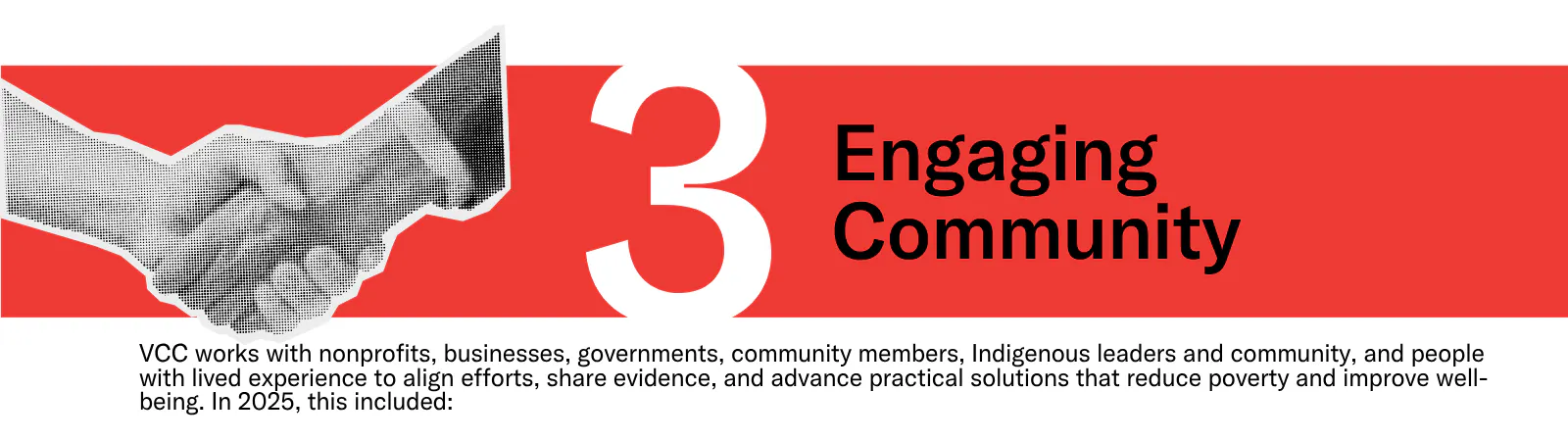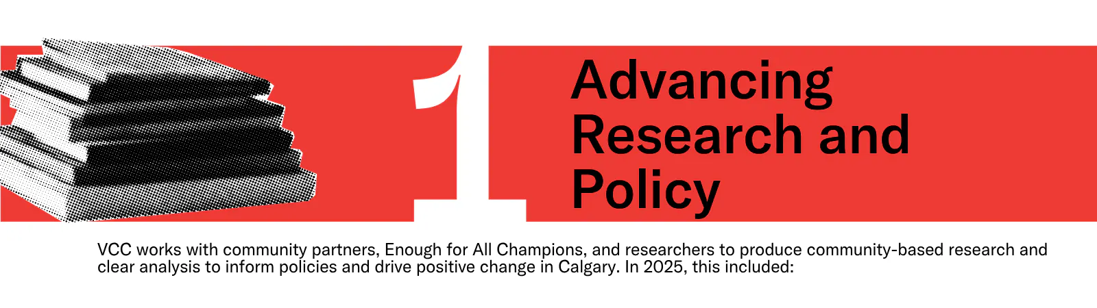 In 2025, VCC marked 20 years of impact, driven by a bold belief that poverty can be reduced not only through programs, but by changing the systems that create it. VCC’s commitment to evidence-based policy and advocacy, meaningful engagement of people with lived experience of poverty, and the integration of Indigenous perspectives has ensured Calgary’s poverty-reduction efforts remain strategic, connected, and effective.